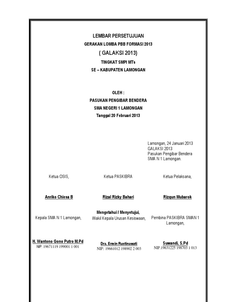 Atas perhatian dan kerjasama bapak/ibu, kami ucapkan terimakasih. Proposal pengajuan dana lomba kreasi baris berbaris (lkbb) azura cup 2 proposal. Mengetahui, ketua panitia ketua osis. Semoga allah swt senantiasa meridoi kegiatan ini. Dengan lahirnya generasi baru,diharapkan kualitas dan kuantitas paskibra sma n 1 wonosegoro dapat menjalankan roda organisasi paskibra kearah yang lebih baik.